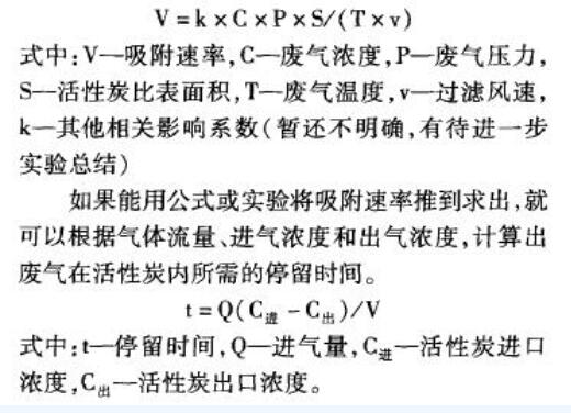 實(shí)際中影響碳層吸附速率的因素有:吸附質(zhì)濃度、風(fēng)壓、溫度、活性炭比表面積等等,各條件參數(shù)之間的關(guān)系可以表示為以下公式: