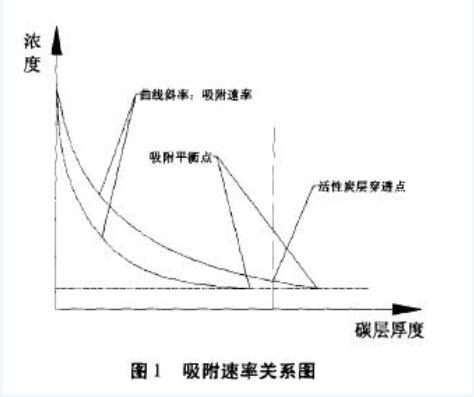同樣的條件下,一般活性炭層的厚度越厚,其去除效率也會(huì)越高,但實(shí)際應(yīng)用中,為提高設(shè)備的經(jīng)濟(jì)性,通常要考慮碳層厚度不能無限制的加厚,因此對(duì)于活性炭層厚度的選擇,需要根據(jù)去除效率要求和碳本身的吸附速率,進(jìn)行有效設(shè)計(jì)計(jì)算。通過圖1可以看出,(1)碳層厚度選擇小,吸附速率慢,碳層就會(huì)容易被穿透,導(dǎo)致去除效率降低;(2)碳層厚度選擇大,吸附速率快,碳層就不容易被穿透,碳可以長時(shí)間使用。